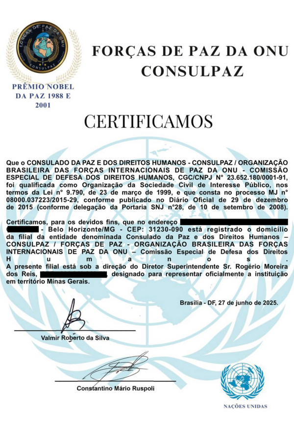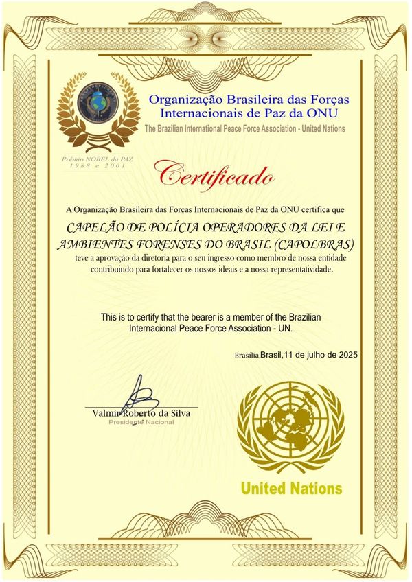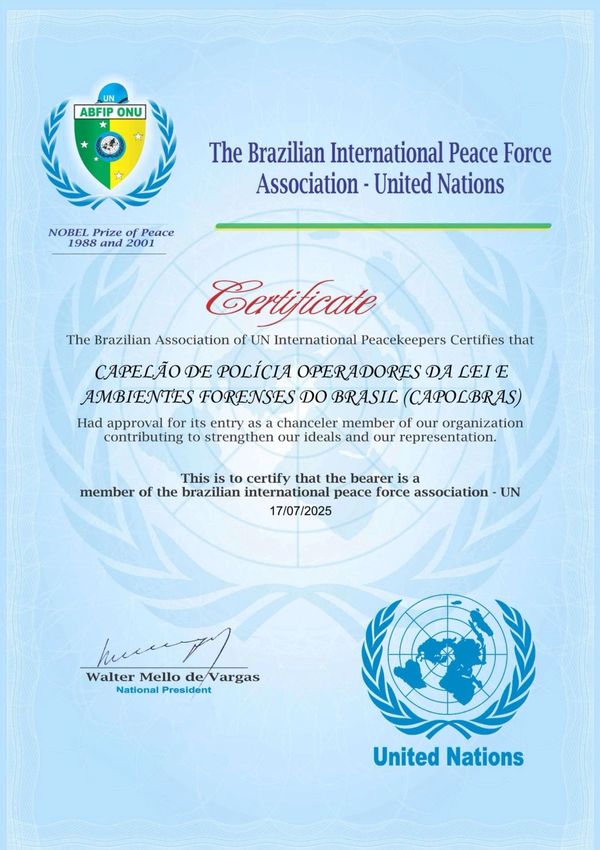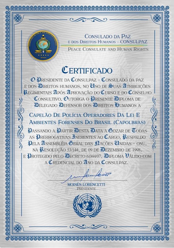 A CAPOLBRAS é colegiada ao Consulado da Paz e dos Direitos Humanos – CONSULPAZ e dos Peacekeepers CONSULPAZ, OSCIP qualificada pelo MINISTÉRIO DA JUSTIÇA e Nações Unidas (0NU).